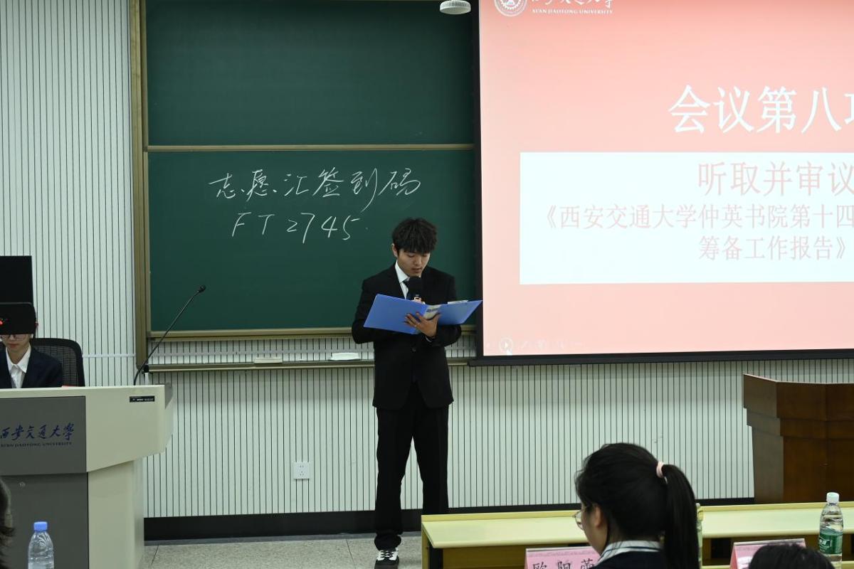 会议第二阶段,大会执行主席候选人王松涛作《西安交通大学仲英书院第十四次学生代表大会筹备工作报告》,大会执行主席候选人胡秉坤作《西安交通大学仲英书院第十四次学生代表大会代表资格审查报告》。《大会主席团组成人员、执行主席、秘书长建议名单》《大会总监票人、总计票人、监票人、计票人名单》及《西安交通大学仲英书院第十四次学生代表大会选举办法》依次进入审议环节,均全票通过。