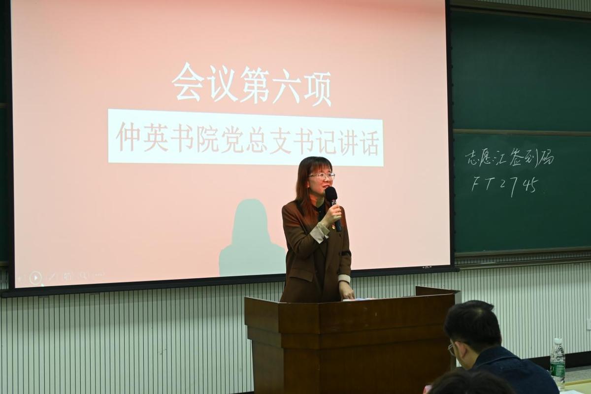 西安交通大学学生会代表李杨对大会召开表示祝贺。她充分肯定了仲英书院学生会在服务同学和深化改革方面取得的成效,并提出三点倡议:一要强化思想引领,传承西迁精神;二要深化组织改革,提升服务效能;三要聚焦主责主业,助力同学成长。她表示,学生代表是连接书院与广大同学的桥梁,肩负着责任与担当,希望全体同学能够助力书院开启学生工作的新局面。