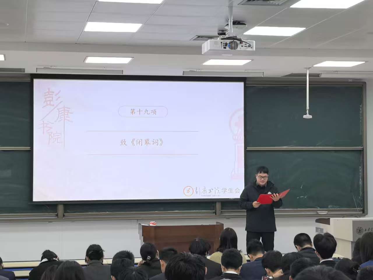 樊成真老师在闭幕词中肯定上一学年学生代表的工作,并向全体彭康学子发出倡议,传承“三活跃”精神,厚植爱国精神、践行志愿者精神,成为全面发展的人才。