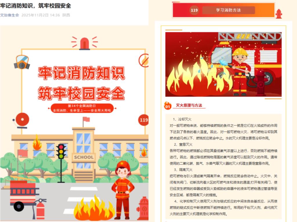 文治书院通过线上线下教育相结合的形式,宣传普及消防教育知识。线下,书院制作消防展板等,通过列举多起校园火灾事故,警醒同学们提高消防意识的重要性;线上,发布多期推送,普及报警求助、扑救火灾、自救及应急逃生等消防常识。