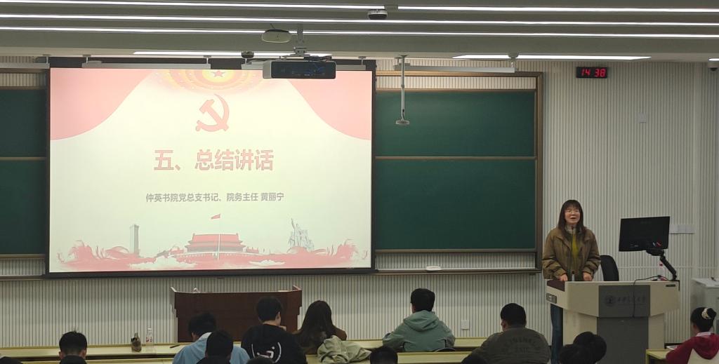仲英书院党总支书记、院务主任黄丽宁从宏大的文明史视角出发,深入解读了“创造人类文明新形态”的时代命题,她指出,中华文明展现了举世无双的顽强生命力,而中国式现代化正是当下这一古老文明新形态的建设方向,其根本在于立足本国国情,并须牢牢把握“接受人民监督”与“勇于自我革命”两大法宝。