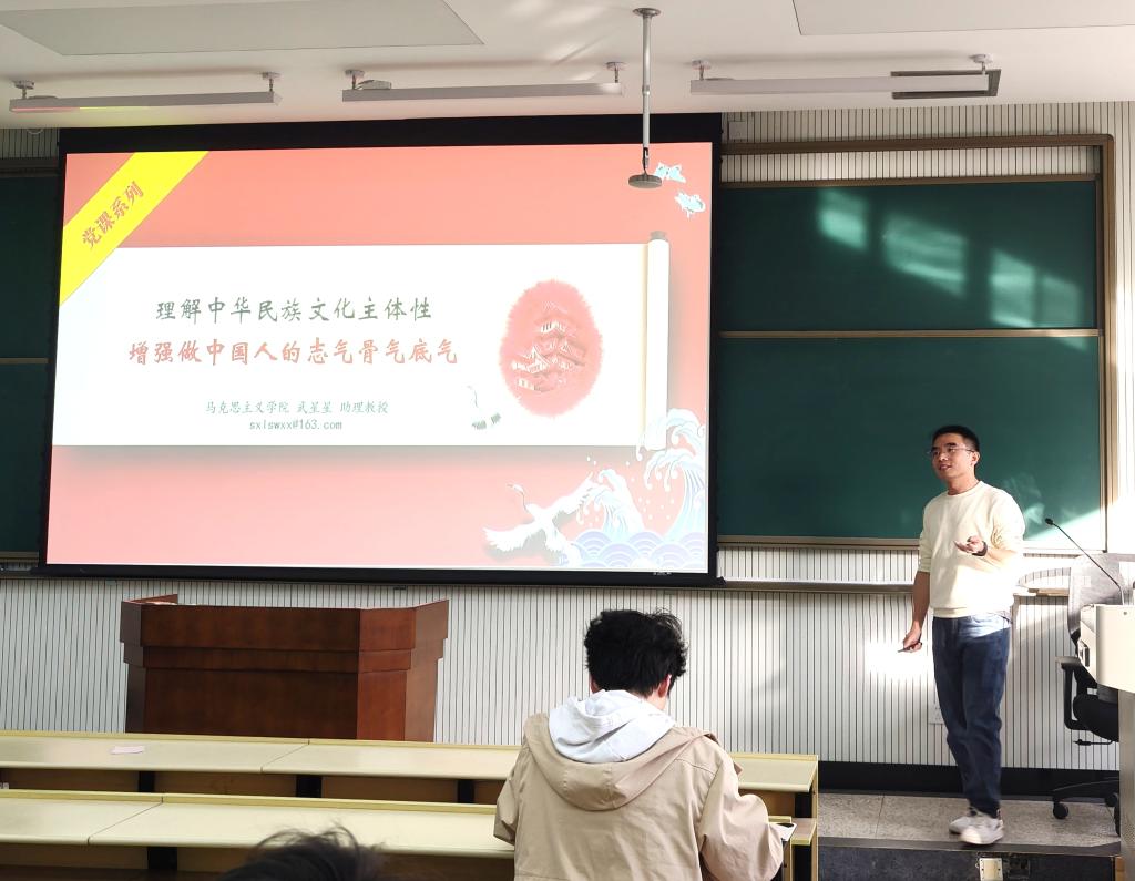 马克思主义学院助理教授武星星以“理解中华民族文化主体性,增强做中国人的志气、骨气、底气”为主题,以历史为引阐释文化主体性内涵,讲解增强文化主体性的六大途径,鼓励同学们通过研习中华文化史、讲好中国故事等方式,在新时代积极传承与发扬中华优秀传统文化,在文化自信中担当时代责任。
