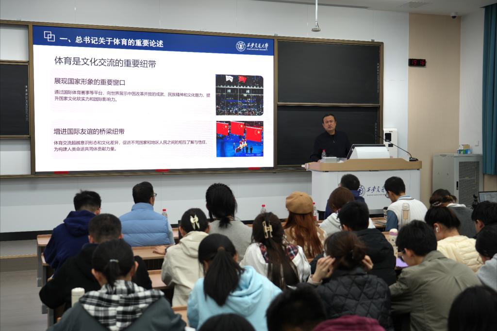 刘长江以近期全运会上交大体育健儿斩获的斐然成绩为切入点,引出本期党课的主题“体育强则国强”。他指出,体育是国家强盛的重要标志,不仅仅承载着民族复兴的梦想,更是社会发展的重要动力。在谈到体育精神的丰富内涵时,刘长江指出,爱国主义是体育精神的核心灵魂,中国体育健儿始终将国家荣誉放在首位,用拼搏诠释对祖国的忠诚与热爱。