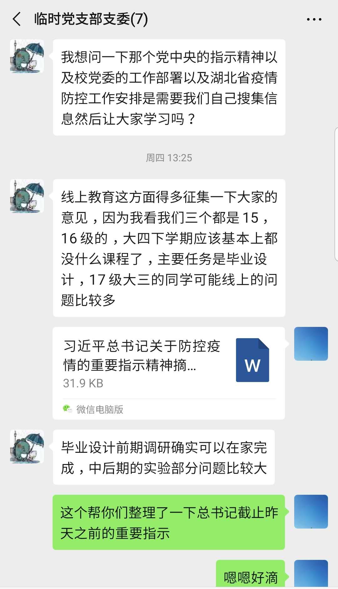 接着,就同学们关心的毕业就业、延迟开学、网络教学等问题,指导老师马瑞和代成军给出予了积极回复,并要求大家遵守湖北省当地政府疫情防控政策,及时准确接收学校通知,学校学工部、学生处等部门会及时解决湖北籍同学的切实问题,如为有需要的同学提供线上课程流量包、临时困难补助等,为大家提供最大限度的帮助便利。书影分享环节中,雷雯雯同志分享系列短片《武汉:我的战疫日记》,展现疫情下的“武汉时刻”,爱国主义、集体主义、英雄主义和乐观主义精神在这些防疫英雄身上体现得淋漓尽致;电影《中国机长》,让我们看到人民信赖的力量,中国防疫的信心。